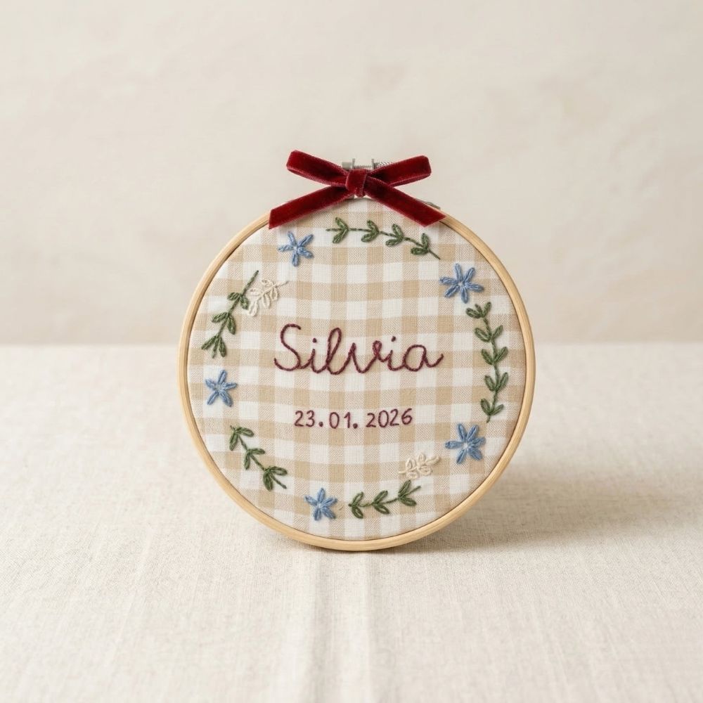 Este bastidor está hecho completamente a mano, con un diseño delicado de flores y ramitas que lo convierte en una pieza especial para decorar la habitación del recién nacido.