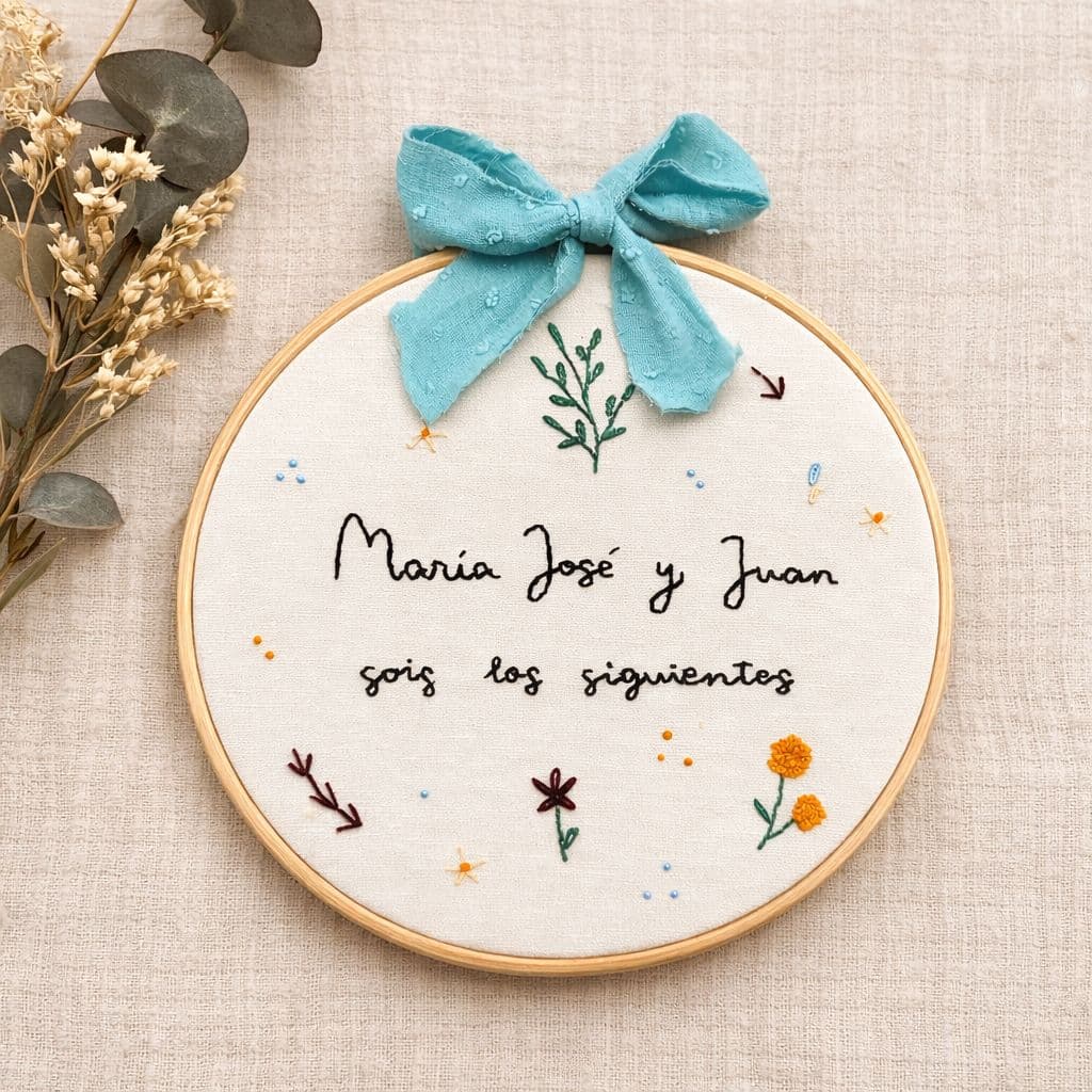 Este bastidor está hecho completamente a mano, con un diseño alegre de pequeñas flores y detalles bordados que lo convierten en el regalo perfecto para anunciar a esa pareja especial que ellos «son los siguientes».