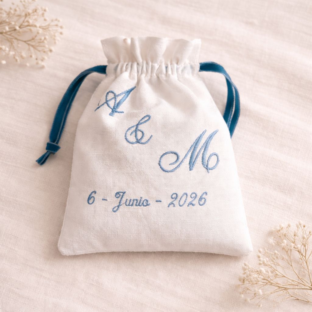 Puedes personalizarla con vuestras iniciales y la fecha de la boda, creando un detalle exclusivo y lleno de significado. El bordado está realizado a máquina, lo que permite un acabado preciso, limpio y muy sofisticado que resalta sobre el tejido.
