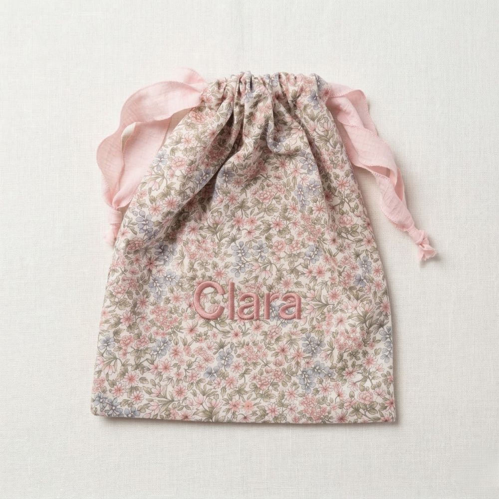 Puedes personalizarla con el nombre, creando un detalle exclusivo y lleno de significado. Además, puedes elegir tanto la tela como el color del bordado (en la foto se muestra un suave tono rosa) para que sea totalmente a tu gusto.