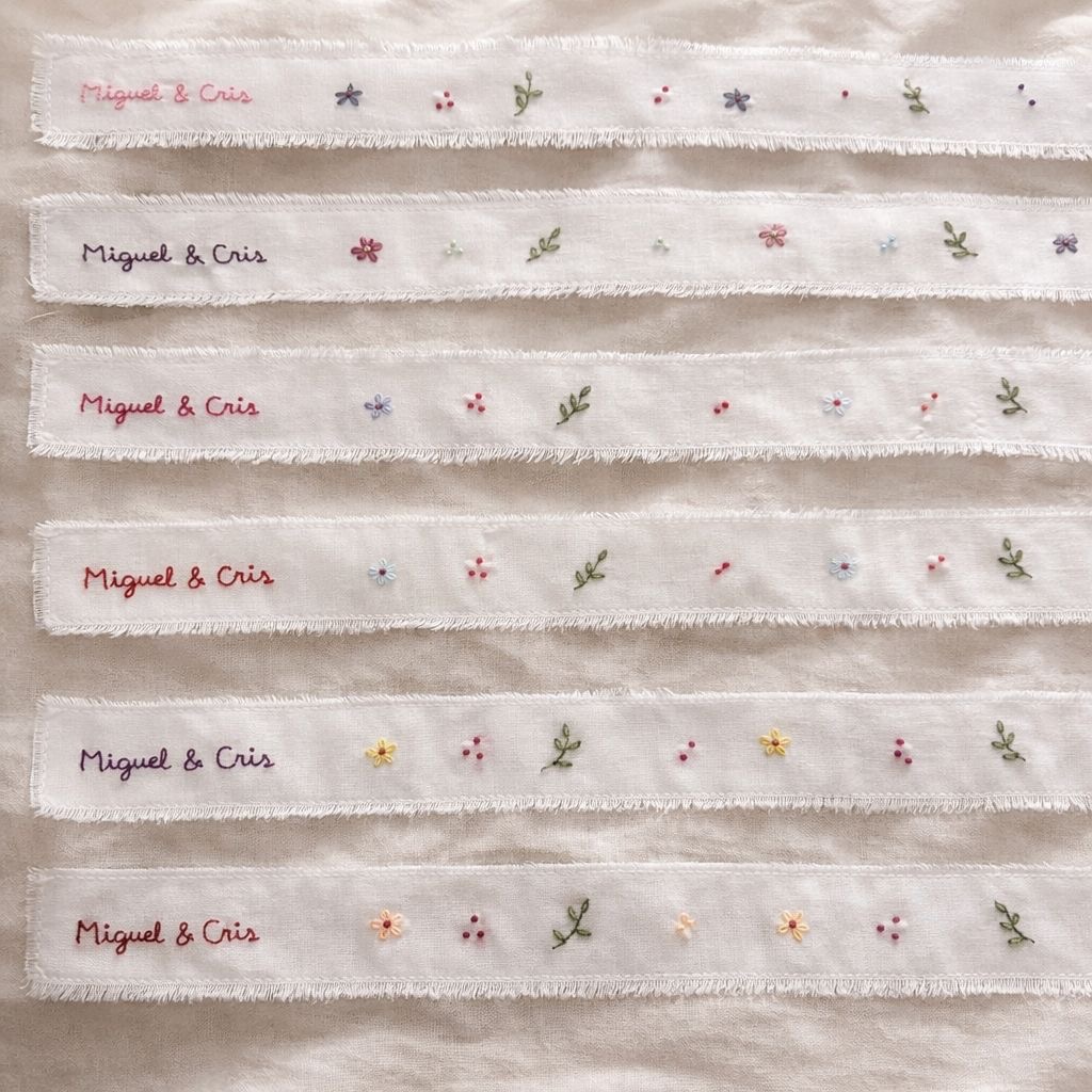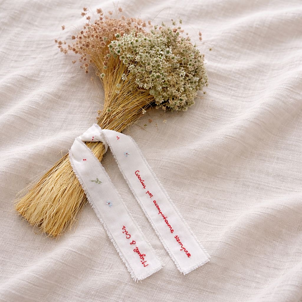 Esta cinta está hecha completamente a mano, con un acabado deshilachado muy romántico y un diseño de pequeñas flores bordadas que la convierte en el complemento ideal para regalar a tus damas de honor, testigos o familiares más allegados con un ramo especial.