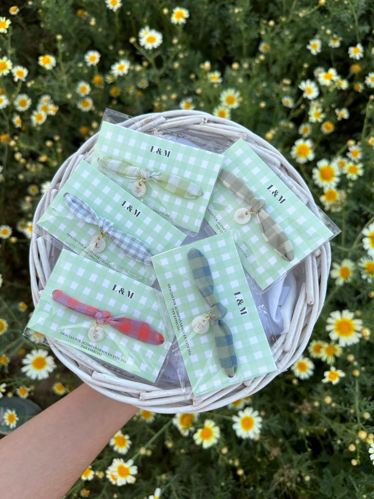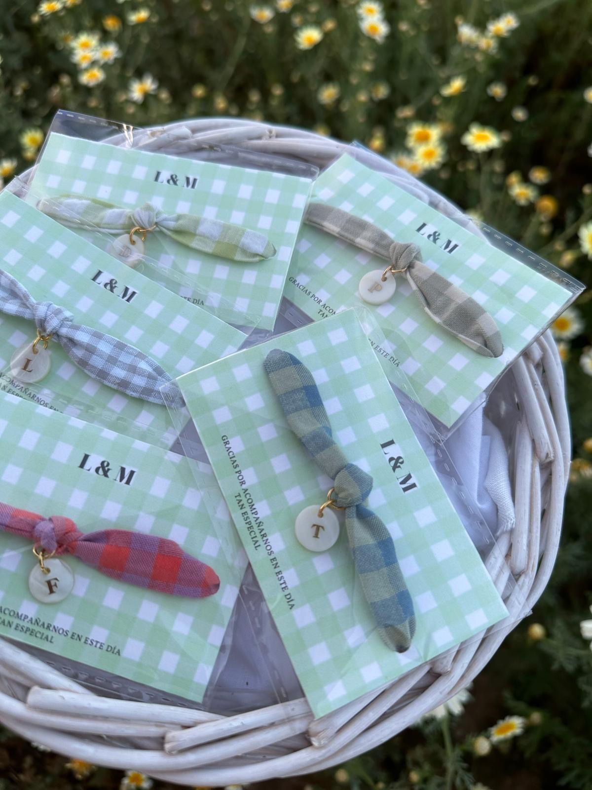 Está confeccionada a mano y lleva una inicial de nácar, aportando un toque sencillo y muy especial.
