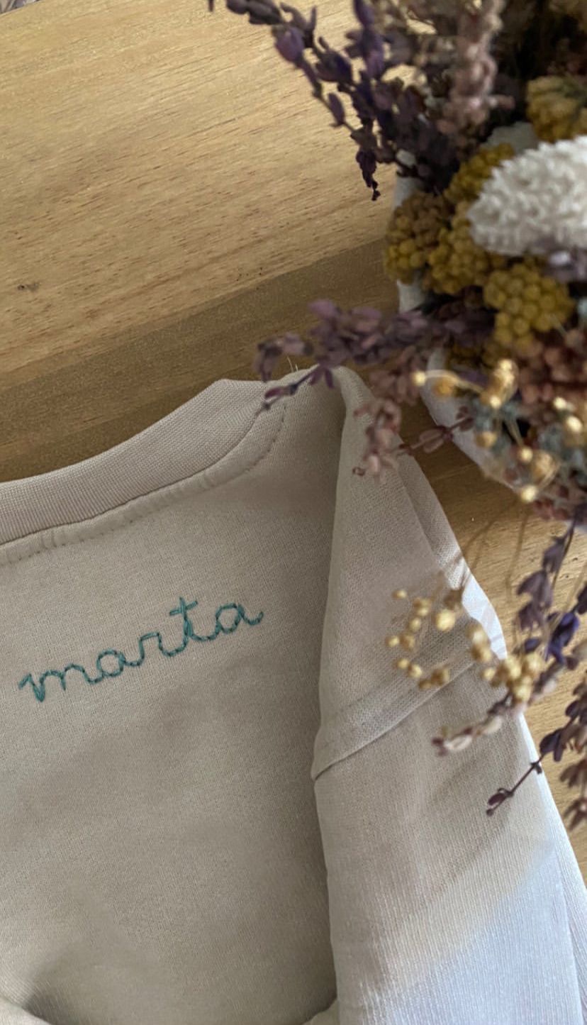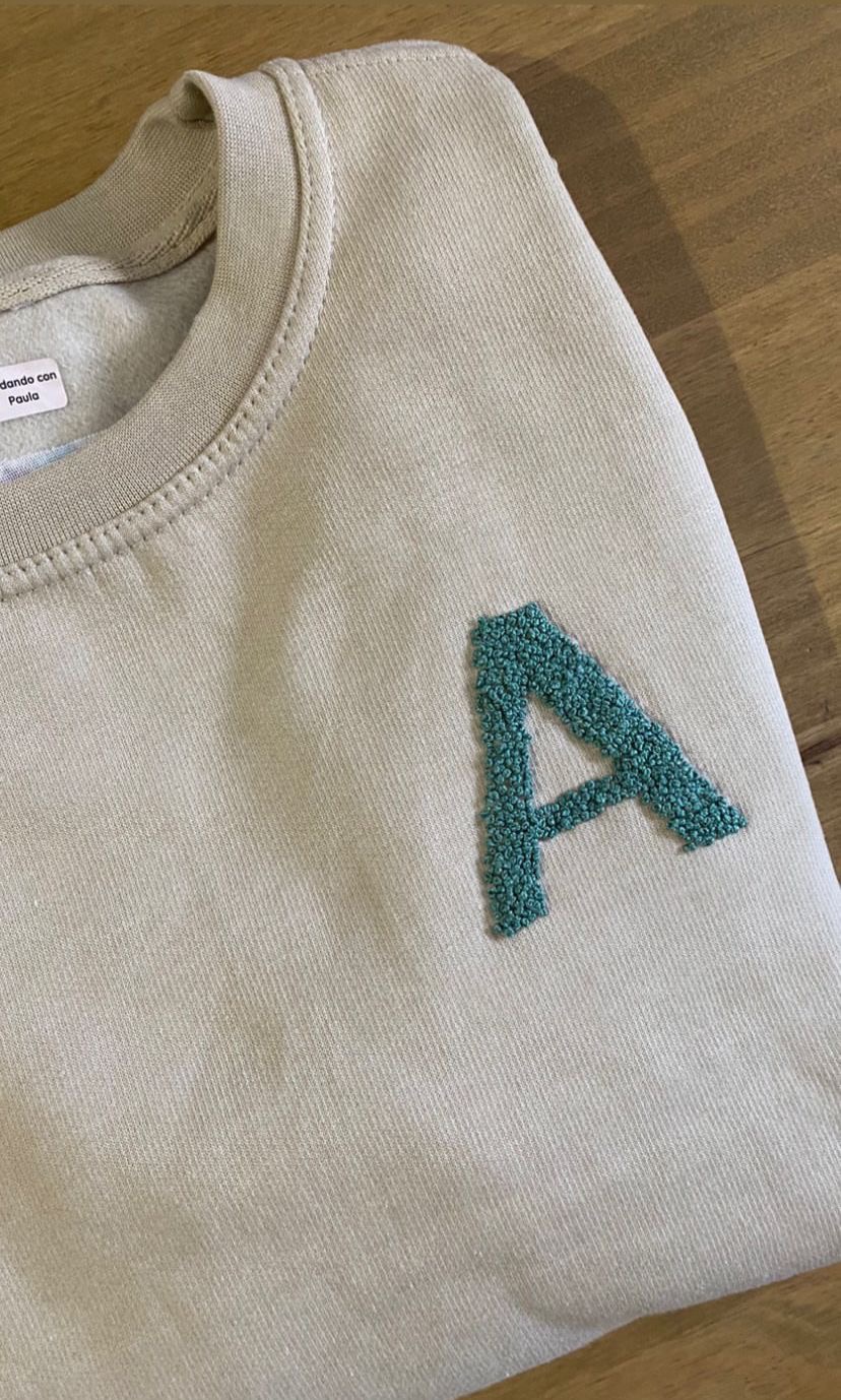 En la parte delantera lleva una inicial bordada en diseño de puntos, y en la parte trasera se borda el nombre, creando un acabado delicado y personalizado.