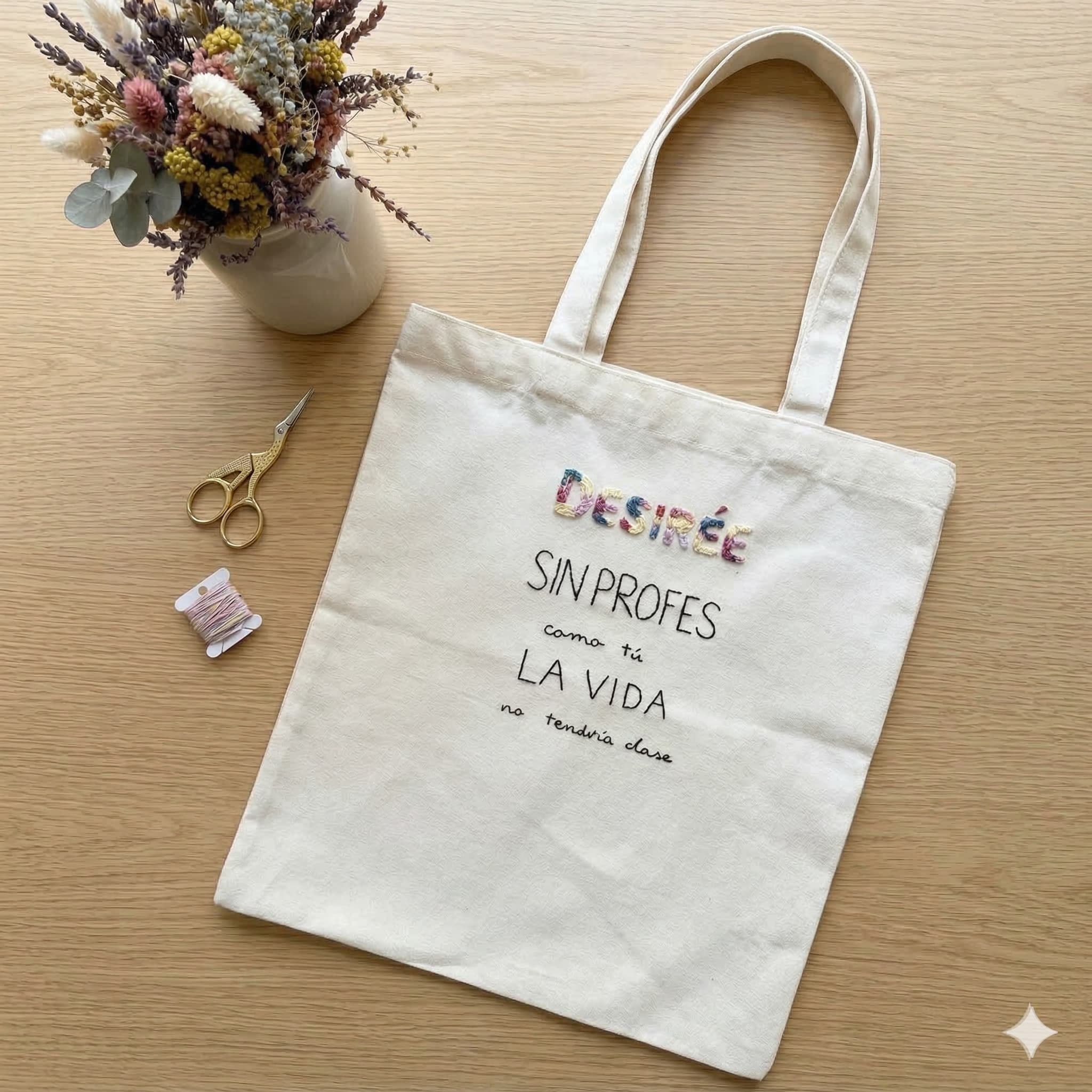 Esta tote bag cuenta con un bordado hecho completamente a mano, con un diseño pensado para que sea una pieza práctica y especial que les acompañe en su día a día en el cole.